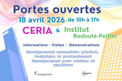 Ça tombe bien ! Venez partager un moment festif et convivial lors de nos Portes ouvertes le samedi 18 avril 2026, de 10h00 à 17h00 sur le Campus du CERIA et à l’Institut Redouté-Peiffer pour y découvrir nos métiers et formations à travers des démonstrations, des séances d’information et des visites sur les deux sites. Des navettes gratuites seront organisées d'un site à l'autre.